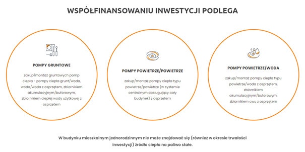 Współfinansowanie inwestycji polegających na zakupie i montażu nowych pomp ciepła (powietrznych i gruntowych) wykorzystywanych do celów ogrzewania lub ogrzewania i ciepłej wody użytkowej w nowych budynkach mieszkalnych jednorodzinnych.