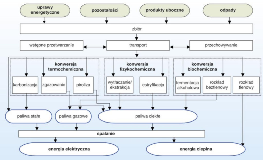 Aby wykorzystać biomasę w celach energetycznych, należy dokonać jej konwersji w biopaliwa. Biopaliwa występują w postaci stałej, płynnej i gazowej.