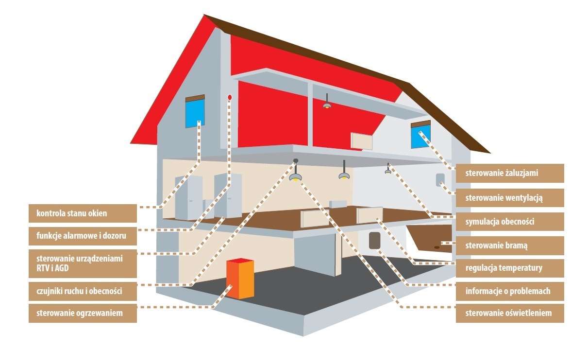 - Podłączony do urządzeń technicznych i instalacji w budynku (np. rolety, instalacja wentylacyjna i c.o. czy oświetlenie).