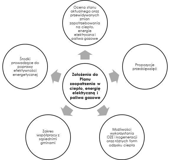 Założenia do Planu Zaopatrzenia w ciepło, energię elektryczną i paliwa gazowe to dokument strategiczny przedstawiający propozycje rozwoju i modernizacji systemów zaopatrujących gminy w ciepło, energię elektryczną i paliwa gazowe. Zgodnie z ustawą z dnia 10 kwietnia 1997 r. Prawo energetyczne (Dz.U. 1997 nr 54 poz. 348 tj. Dz.U. 2021 poz. 716 z późn. zm.) gminy są zobowiązane do sporządzenia takiego dokumentu na okres co najmniej 15 lat i aktualizowaniu go co najmniej raz na 3 lata. Z tej samej ustawy wynika również obowiązek nieodpłatnego udostępnienia przez funkcjonujące na terenie gminy przedsiębiorstwa energetyczne planów oraz propozycji rozwoju w zakresie zaspokojenia obecnego i przyszłego zapotrzebowania na paliwa gazowe, ciepło i energię elektryczną i uwzględnieniu ich w projekcie założeń.