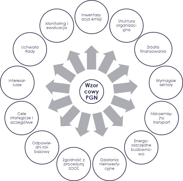Pierwszym krokiem przy sporządzaniu PGN jest stworzenie bazowej inwentaryzacji emisji, co pozwoli na zidentyfikowanie kluczowych obszarów emisji, a następnie określenie celów i działań (inwestycyjnych i nieinwestycyjnych) z zakresu poprawy efektywności energetycznej, OZE, które przyczyniają się do redukcji emisji. W dokumencie należy również określić wskaźniki, które posłużą do monitoringu zmian wynikających z wdrożonych działań. Dokument przyjmowany jest uchwałą przez radę gminy i wdrażany do realizacji.