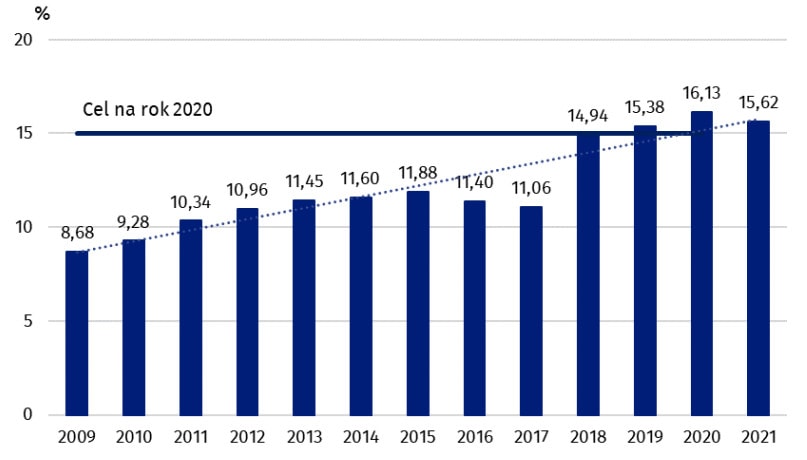 Zgodnie z dyrektywą Parlamentu Europejskiego i Rady 2009/28/WE z dnia 23 kwietnia 2009 r. w sprawie promowania stosowania energii ze źródeł odnawialnych, państwa członkowskie były zobowiązane do zapewnienia określonego udziału energii ze źródeł odnawialnych w końcowym zużyciu energii brutto w 2020 r. Obowiązkowe krajowe cele ogólne składają się na założony 20% udział energii ze źródeł odnawialnych w końcowym zużyciu energii brutto we Wspólnocie. Dla Polski cel ten został ustalony na poziomie 15%. Ponadto, każde państwo członkowskie zostało zobligowane do tego, aby w 2020 r. udział energii ze źródeł odnawialnych we wszystkich rodzajach transportu wynosił co najmniej 10% końcowego zużycia energii w transporcie.