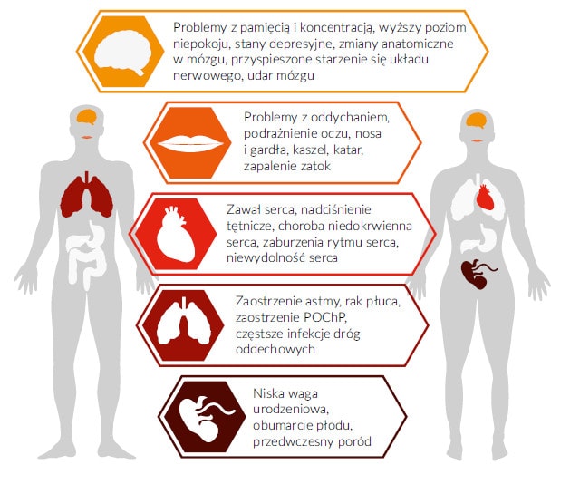 Oddychanie jest podstawową funkcją życiową człowieka, jednak w przypadku gdy mieszanina, którą wdychamy jest przepełniona pyłami oraz innymi zanieczyszczeniami, na pewno nie jest to czynność przyjemna. Człowiek czasem automatycznie wzbrania się przed wzięciem oddechu, gdyż wie, że zanieczyszczenia te mogą mieć negatywny wpływ na jego organizm. Najbardziej podatnymi grupami na wpływ zanieczyszczeń są dzieci (w tym także w okresie życia płodowego) oraz seniorzy (w szczególności Ci z istniejącymi chorobami przewlekłymi).